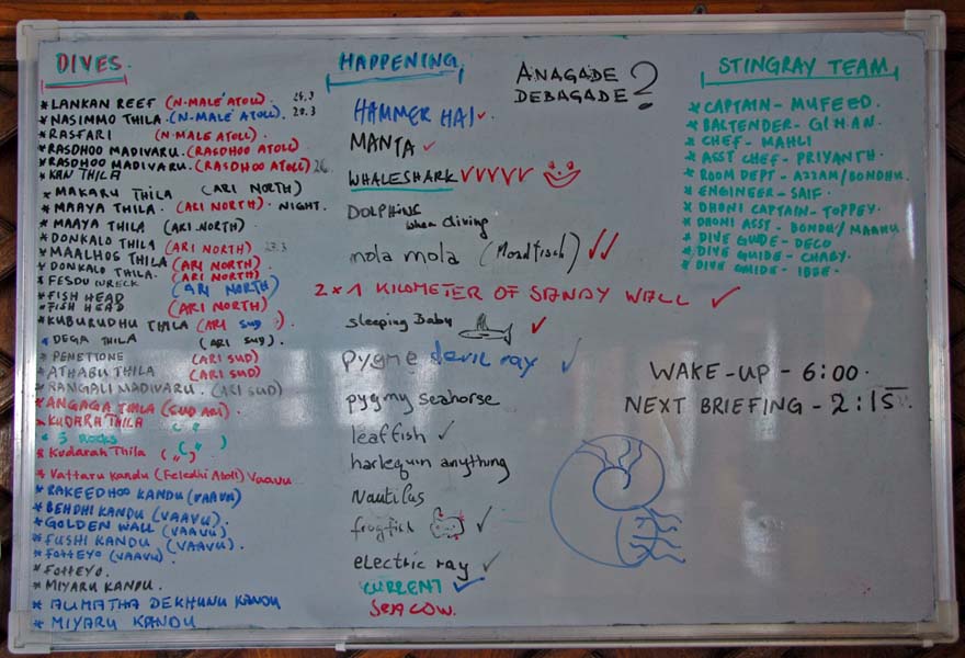 Our dive site, request and sighting list. Note the rare sightings of "1 kilometer of sandy wall" from a couple of unintentional outside reef dives...