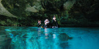 We did 'caverns', where the entrance is visible and no more than about 200 feet away. But we also did a fair amount of 'cave' diving, where the entrance is not visible or necessarily very close and there is no external lightsource. The caves are generally shallow; we never went below about 50 feet. Because they're filled by rainwater, most of the water is fresh. However, salt water does creep in sink to the bottom, because it's denser than fresh. At some level, the two meet in blurry mixture called a halocline. In one of the caves, the water very near the bottom was much warmer than the higher water. But the halocline was so strong and blurry, that even with my flashlight pointed straight down, I could not tell how close I was to hitting the silty bottom, so I could not enjoy the warmth just inches away from me!