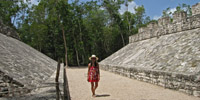 The ruins at Coba aren't terribly spectacular, but they are a nice mix of rubble and restoration. Most fun is that the big pyramid towering over the jungle can be climbed for a great view. The three sets of ruins are each about a half mile apart, so it was a good walk for us. The less motivated have a gaggle of bicycle rikshaw drivers at their disposal to save legs for the pyramid.