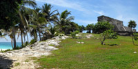 The walled ruins of Tulum sit on a 40' bluff overlooking the Caribbean. The combination of jungle, sea and ruins make for a really beautiful site. Even better, there's a nice beach right below the ruins that is accessible via a long staircase. There's a tremendous population of healthy lizards, a few up to 3 or 4 feet, that wait patiently for tourists to drop a snack... or small children... One end of the beach is isolated for turtles to nest in. Protective net enclosures are built quickly to protect the eggs from the voracious lizards.